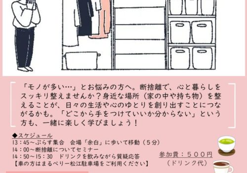 - こんにちは。 ぷらすから在職者交流会縁ingのお知らせです😊 「モノが多い…」「片付けをどこから手をつけていいか分からな […]